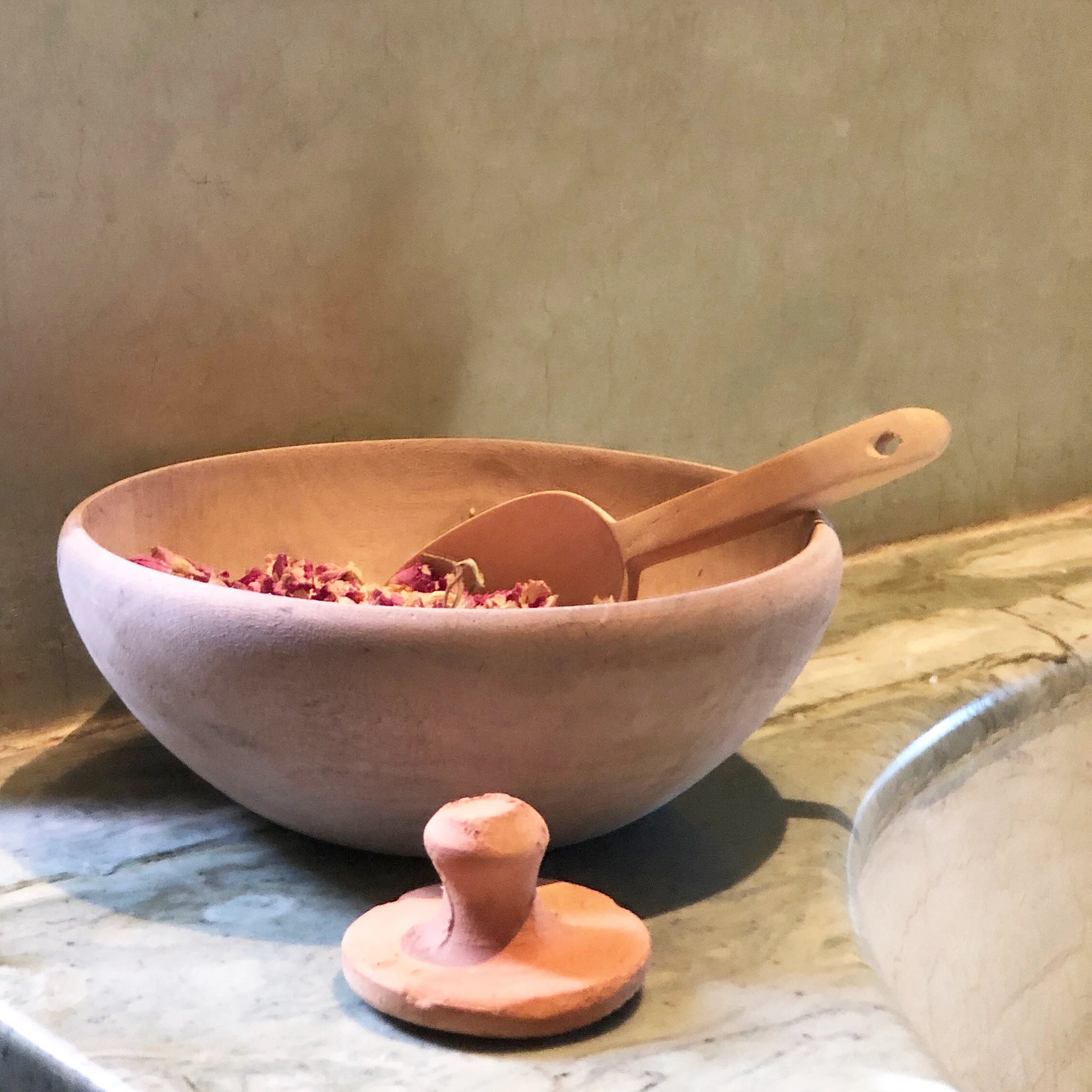 terra cotta bowl of soaking salts and roses alongside a heel-stone waiting for us in the riad