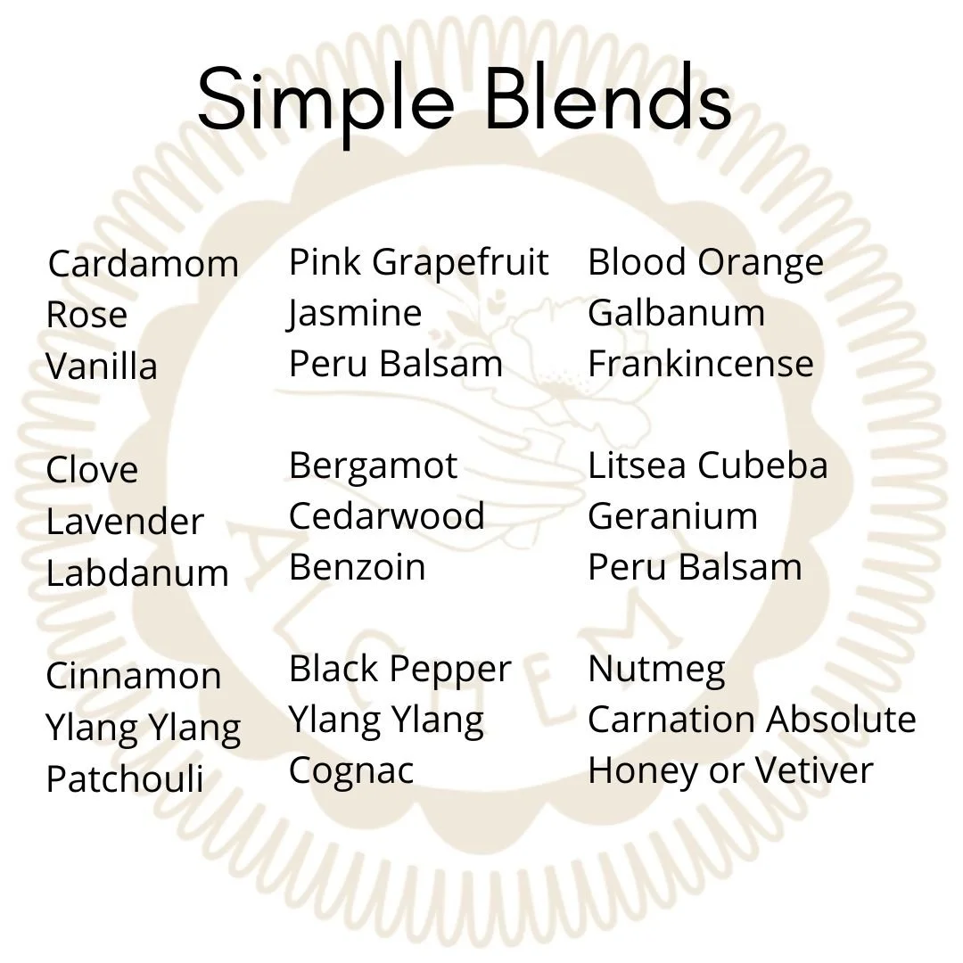 Each grouping has three ingredients: top, middle, and base note. Use them as a final blend, or the framework. Most ingredients are available from Eden Botanicals in sample sizes that can be diluted into your carrier (an oil such as moringa seed or jojoba) or into alcohol.